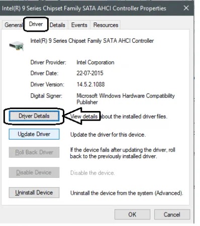 To ensure you have chosen the right controller from the driver choose Driver details from Driver Tab. Check whether iaStorA.sys is under the driver list. Now click on the OK button to exit.